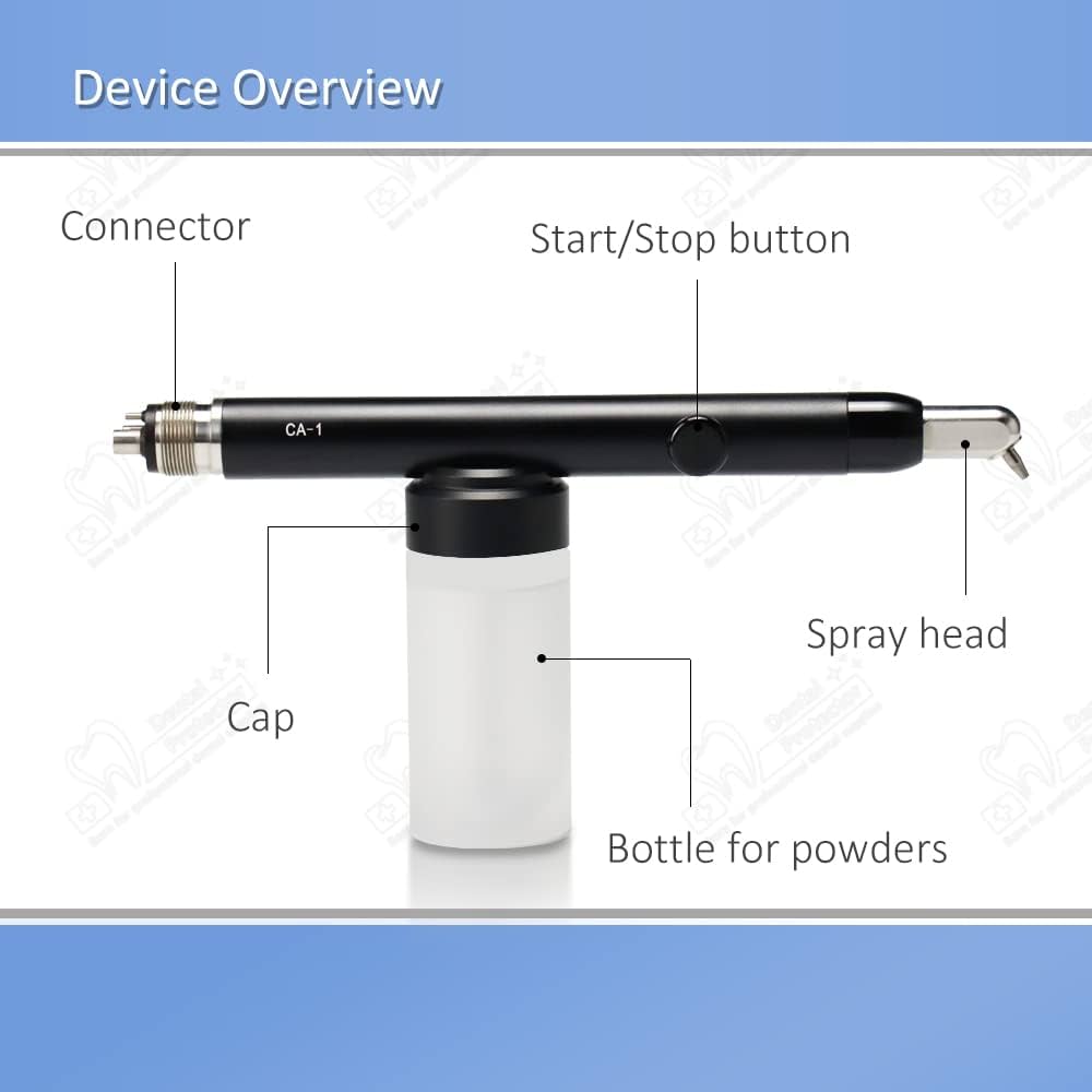 Συσκευή αμμοβολής για την αποτριβή και την επεξεργασία των συγκολλούμενων επιφανειών στεφανών, γεφυρών, ενδορριζικών αξόνων κτλ. Ιδανικό για όλα τα μέταλλα και τα κεραμικά υλικά: 50 microns. Για γυάλισμα επιφανειών: 27microns.